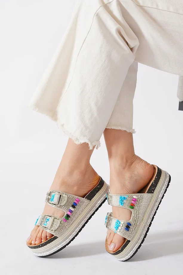 Günlük stilinize zarif bir dokunuş katmak için tasarlanan bu terlik, hem modern hem de göz alıcı detaylarıyla öne çıkıyor. Gümüş rengin ışıltısı, taş desenli yüzeyle birleşerek sofistike bir görünüm sunarken; çift toka detayı ise hem estetik hem de ayak yapınıza göre ayarlanabilir konfor sağlıyor.