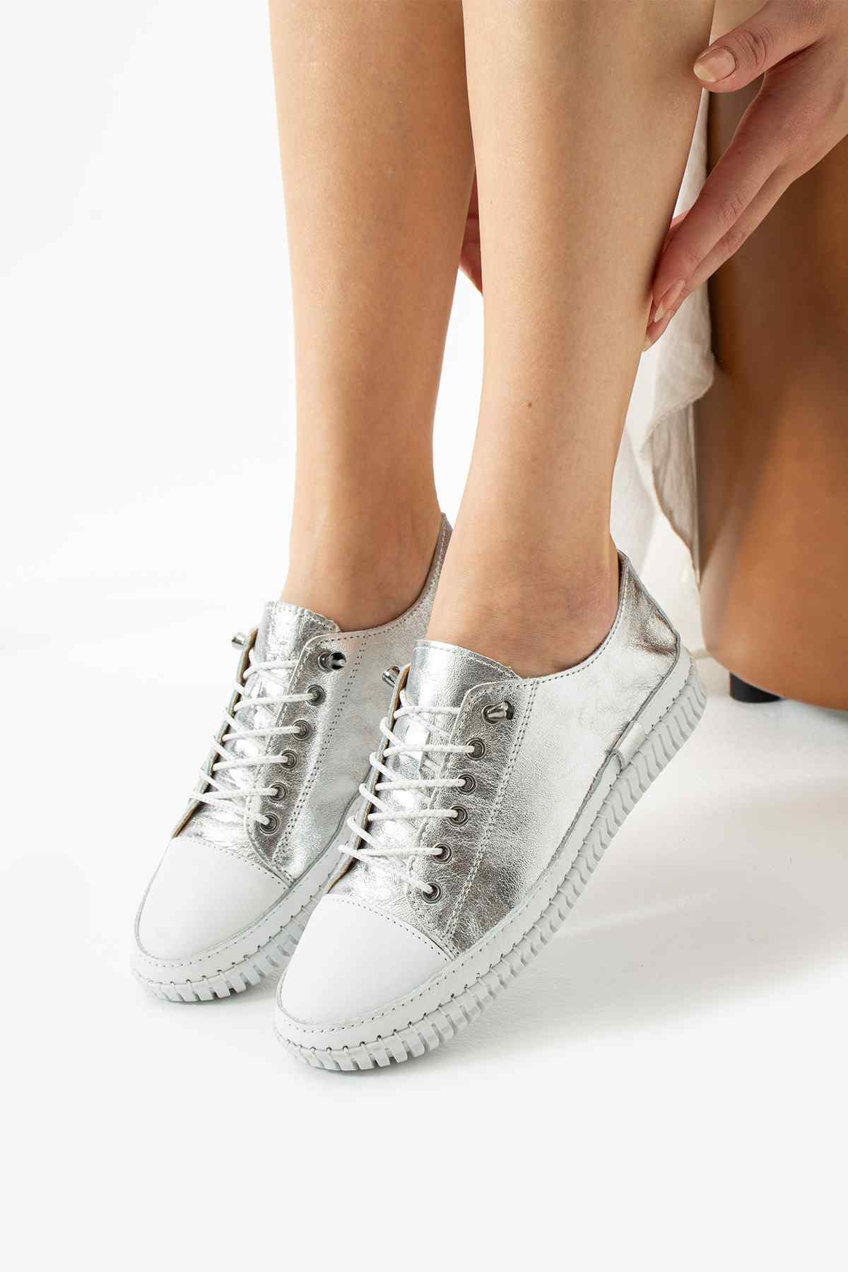 Malzeme: Metalik deri ve beyaz kauçuk taban kombinasyonu