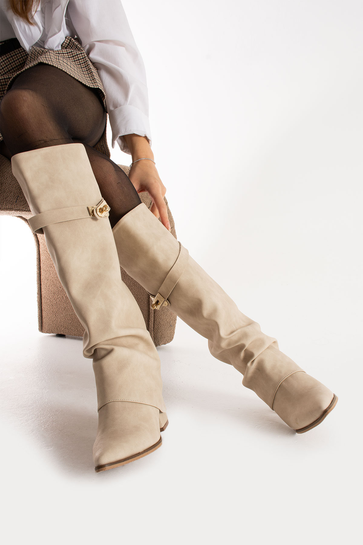 Altın Renkli Tokalar: Modern ve zarif bir görünüm sağlayan altın renkli tokalar, botun tasarımını tamamlar.